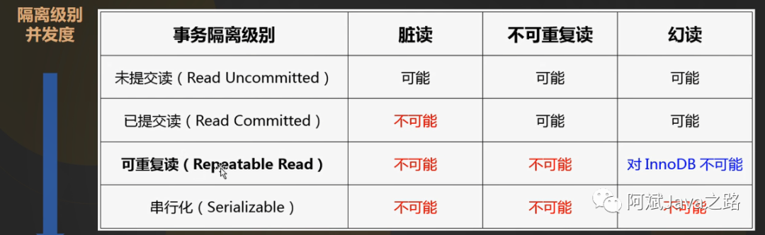 来保证一致性(Consistency):事务开始前和结束后,数据库的完整性约束没有被破坏 。比如A向B转账,不可能A扣了钱,B却没收到。 隔离型(Isolation):一个事务的执行不能被其它事务干扰。即一个事务内部的操作及使用的数据对其它并发事务是隔离的,并发执行的各个事务之间不能互相干扰。 mvcc