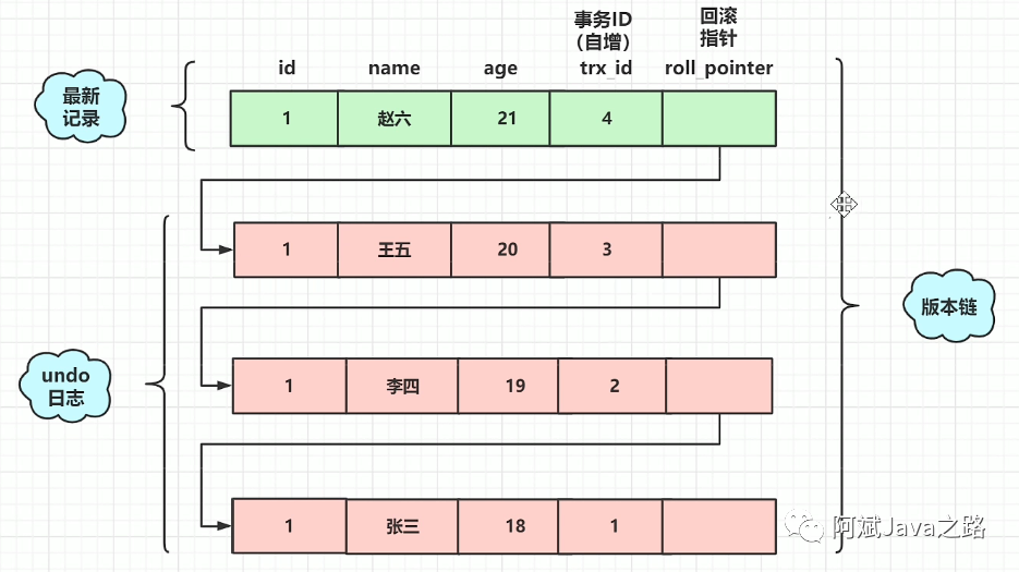 7byte,回滚指针,指向这条记录的上一个版本(存储于rollback segment里)DB_ROW_ID