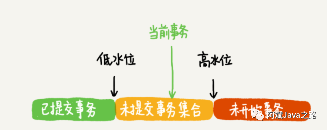 事务id是递增的只会越来越大,在开启事务的时候,第一次快照读会产生一个读视图,将目前活跃的还未提交的事务记录下来,并排序出最低事务和最高事务。