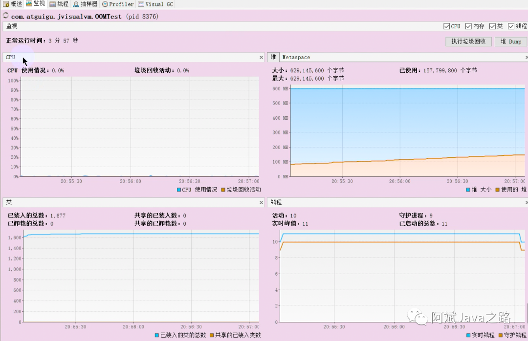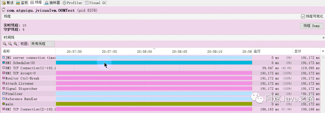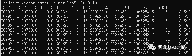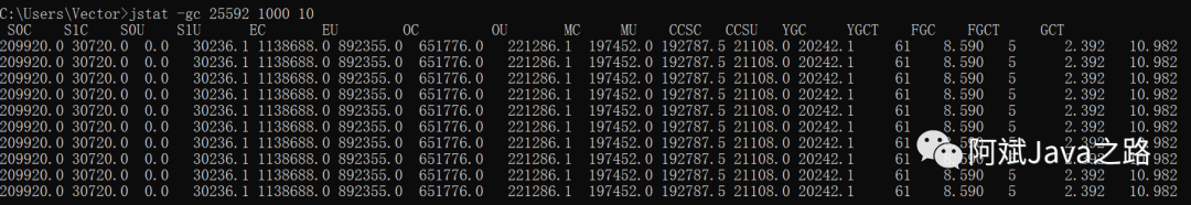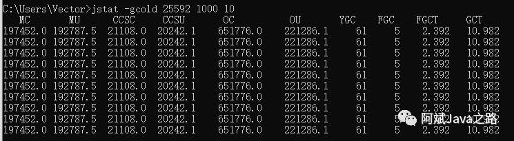 jstat(JVM Statistics Monitoring Tool):用于监视虚拟机各种运行状态信息的命令行工具。它可以显示本地或者远程虚拟机进程中的类装载、内存、垃圾收集、JIT编译等运行数据。在没有GUI图形界面,只提供了纯文本控制台环境的服务器上,它将是运行期定位虚拟机性能问题的首选工具。常用于检测垃圾回收问题以及内存泄漏问题。