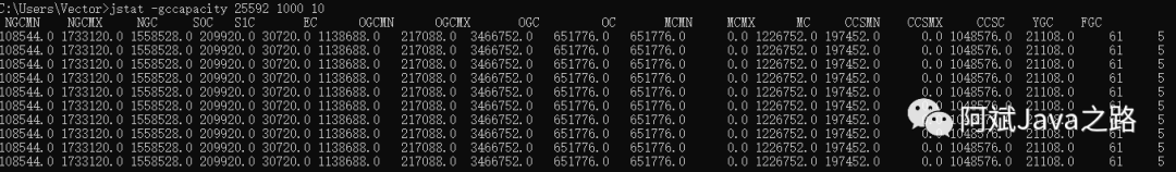 :显示与GC相关的堆信息。包括Eden区、两个Survivor区、老年代、永久代等的容量、已用空间、GC时间合计等信息。- gccapacity