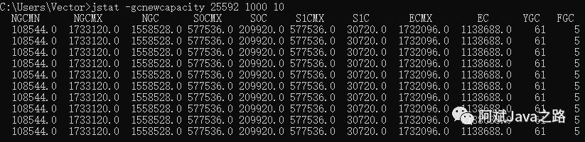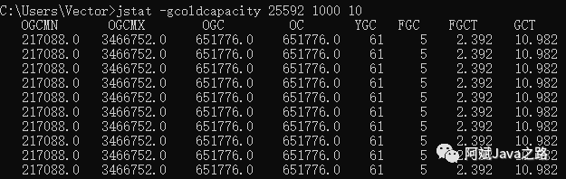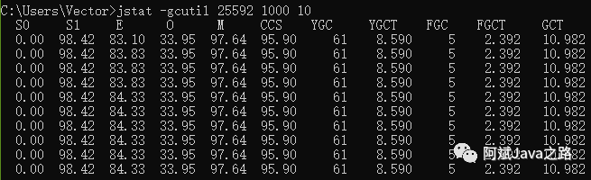 :显示内容与-gc基本相同,但输出主要关注Java堆各个区域使用到的最大、最小空间。-gcutil