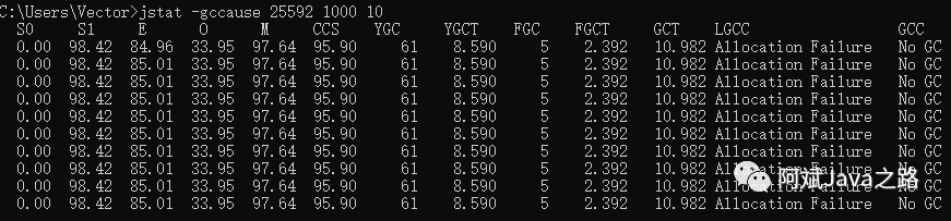 :显示内容与-gc基本相同,但输出主要关注已使用空间占总空间的百分比。-gccause