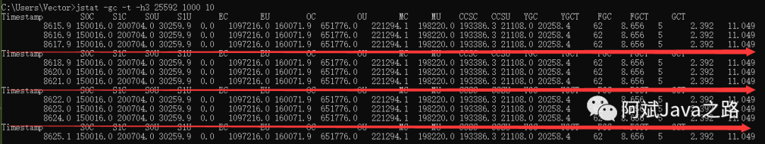 -h参数: 可以在周期性数据输出时,输出多少行数据后输出一个表头信息