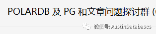 最近问问题的同学挺多的,也有问有没有群的,实在是忙没有建群,所以问的人多了,想想还是建一个群,但本人写文章不懒,其他的比较懒,因为问POLARDB 的问题的多,所以建立了一个 POLARDB 和 PG,MYSQL 8 以及文章问题的讨论群。希望能帮助自己也帮助大家共同提高,要进群的,可以添加微信 liuaustin3 ,来申请加群
