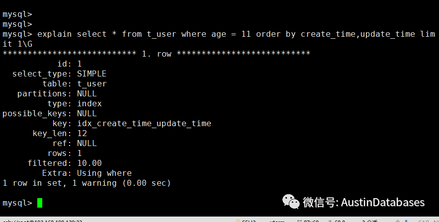 explain select * from t_user where age = 11 order by create_time,update_time limit 1;