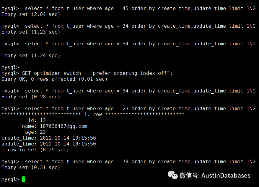 2 在某些情况下,非主键的 where 条件,在打开 perfer_order_index 后,可能查询比不打开功能要快,但有些时候要慢,这取决于使用 order by 后的条件索引扫描时,相关where 条件的值在索引中遍历到的位置,位置靠前,速度快,位置靠后,查询速度慢。
