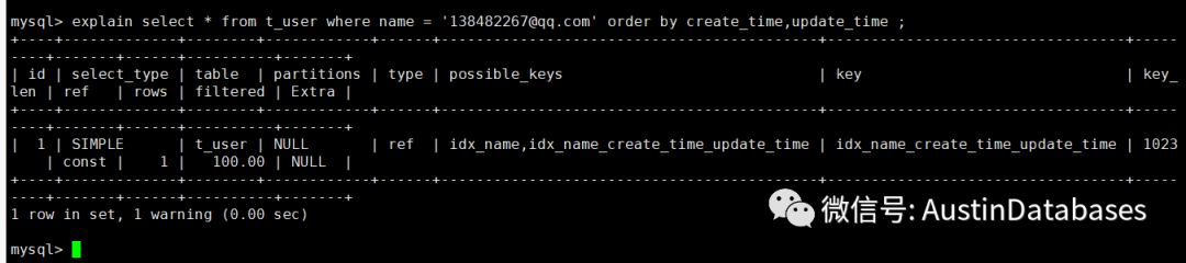 explain select * from t_user where name = '138482267@qq.com' order by create_time,update_time ;