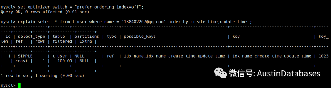 下面我们删除这个索引,在此查询,发现MYSQL 8在打开 perfer_order_index 后的在没有合适的索引的情况下,还是走了同一种索引,以WHERE 条件为准