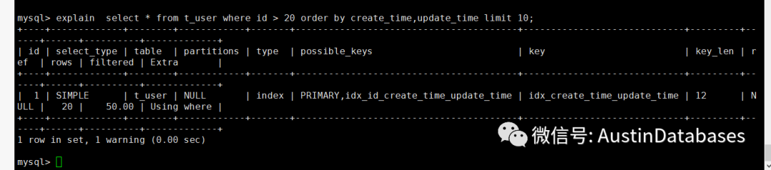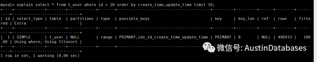 从这个语句可以明确的看到排序走了filesort ,虽然我们建立了 create_time 和 update 的索引,但是因为我们的条件中并未含有 create_time或者update_time 的字段条件,所以最终MYSQL 8.030并未使用order by 排序相关的索引。
