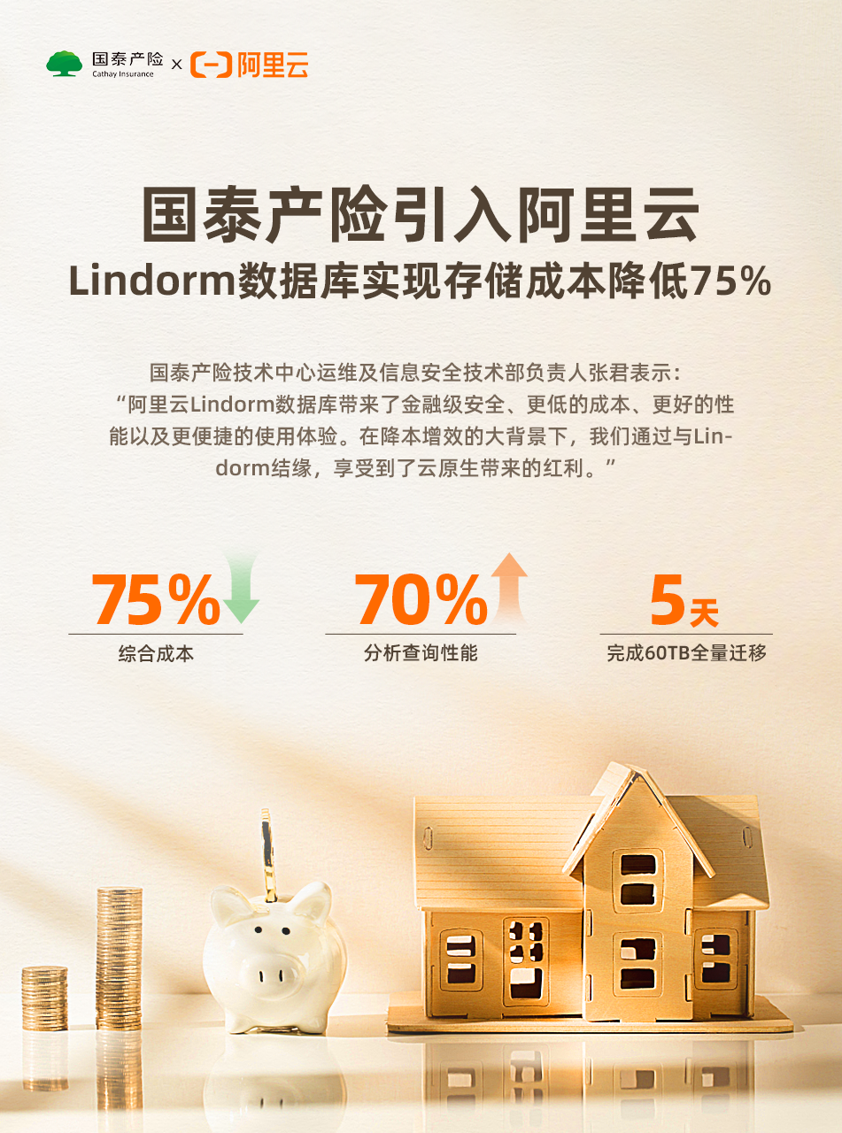 国泰产险于2008年在上海成立,迄今已在东南沿海和中西部地区9个省市设立25家分支机构。公司立足“科技保险”战略目标、推进“保险+科技+服务”新模式,致力实现全流程数智服务,以专业化服务优势,叠加科技赋能,精准对接细分市场的差异化需求,实现互联网业务与传统业务双向融合,让每个人更简单地享受保险。近年来,随着互联网业务增长迅猛,国泰产险业务量剧增,保单量巨大,这导致所需的数据库资源呈指数级增加,且业务在线化的特点使国泰产险对故障停机的容忍度极低。为此,国泰产险技术中心构建了热、冷、温数据的三层存储架构:第一层为在线交易库,主要负责热数据存储和事务性操作;第二层为支持离线数据分析的数据仓库层,支持大数据存储及分析计算;而由于历史保单数据一般不做修改,且查询频率也较低,但是对查询效率有一定要求,因此在热数据层和冷数据层之间增加了第三层——基于HBase构建的历史保单温数据层,不仅可以减轻上层OLTP压力,提供历史保单的大容量低成本存储,还能进一步缩短线上业务对历史保单查询的调用链路,实现高效查询。然而,随着业务的快速扩张,HBase中日增数据达上亿条,日均增长规模超过200G,庞大的数据量让国泰产险很快遇到了存储成本高、数据安全风险、运维体验不佳等问题。应对以上挑战,国泰产险采用阿里云Lindorm数据库对历史保单平台进行了重建,并对全量历史保单数据进行了迁移。与HBase不同,Lindorm是云原生计算存储分离架构,计算资源与存储资源无绑定,扩容存储的时候,计算资源不会被动地扩容,因此可减少50%计算节点。而通过选用容量型存储及Lindorm独家支持深度优化的ZSTD压缩,还可使存储效率进一步提升,整体综合成本下降75%;同时,Lindorm基于自研引擎,在兼容HBase的基础上,吞吐性能提升了3倍以上,查询性能提升70%,很好的满足历史账单在线查询需求。在大幅降本提效的基础上,金融级可靠性方面,Lindorm的账户密码认证和ACL,以及透明数据加密TDE功能,共同为国泰产险构筑了数据金融级安全防护;而Lindorm秒级自动故障恢复的能力也极大的提升了运维的效率。据了解,Lindorm提供跨机房容灾方案,数据一致性级别可配置,既支持“强一致”,也支持“最终一致”,可进一步确保在线业务的容灾能力。目前,国泰产险在LTS数据迁移服务助力下,5天之内完成60TB全量迁移与增量同步,这比业务预期提前了2天,迁移过程中也保证了7*24小时服务不中断。国泰产险技术中心运维及信息安全技术部负责人张君表示:“阿里云Lindorm数据库带来了金融级安全、更低的成本、更好的性能以及更便捷的使用体验。在降本增效的大背景下,我们通过与Lindorm结缘,享受到了云原生带来的红利。”据介绍,阿里云原生多模数据库Lindorm是国内首个通过中国信通院防篡改的NoSQL数据库,支持宽表、时序、对象、流、时空等多种数据的高性能、高吞吐、低成本存储和融合处理分析;支持云原生存储计算分离技术,具备极致弹性能力;使用标准SQL统一访问,同时也兼容HBase、InfluxDB、OpenTSDB、S3等多种开源标准接口。历经了十余年阿里集团复杂业务场景的考验,支撑了淘宝、天猫、菜鸟网络等核心业务。目前,Lindorm已服务汽车、金融、工业物联网等多个行业的客户。