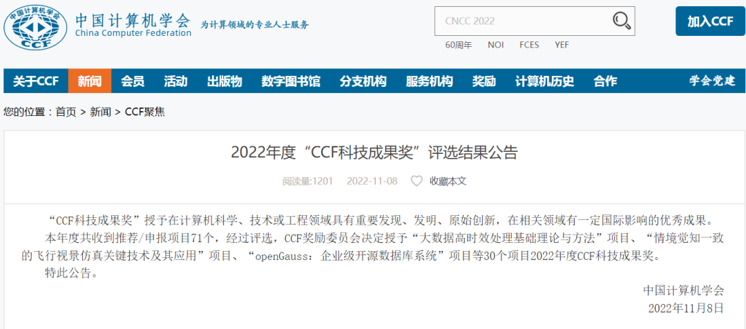 2022年11月8日,中国计算机学会(CCF)发布了2022年度“CCF科技成果奖”评选结果。华为与清华大学、中国移动联合申报的“openGauss:企业级开源数据库系统”凭借在企业核心应用场景、在NUMA-Aware事务处理方法、主备共享存储技术、AI算子加速等核心技术创新获得组委会一致认可,最终获得2022年度“CCF科技成果奖”下设的“科技进步特等奖”。据悉,特等奖为该奖项中的最高级别奖项。