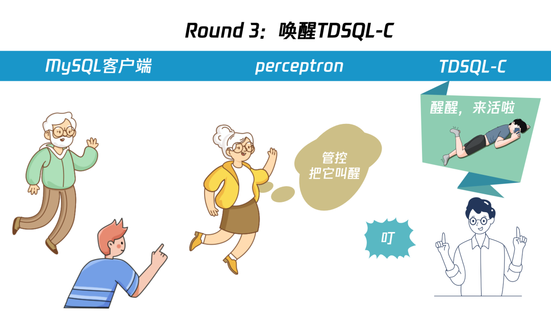 这一方案的核心要点是在 TDSQL-C 的接入层增加了一个恢复感知器(下文简称:perceptron),通过 perceptron 模块来实现请求转发,perceptron 在和客户端握手之后,不断开与用户连接,恢复实例后,与 TDSQL-C 握手,后续转发四层报文。以下为 perceptron 与 TDSQL-C 建连的具体过程: