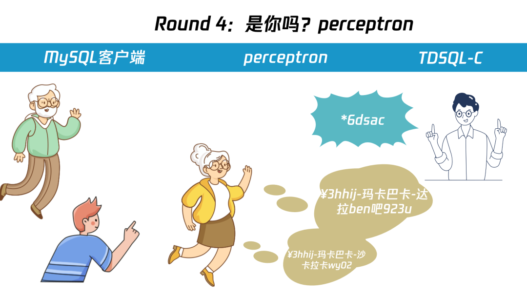 在和 preceptron TCP 握手之后(P4),对于 TDSQL-C 来说,preceptron 也是一个普通的 MySQL 客户端,所以也发送一个 “随机数 B” 挑战(P5)给 preceptron。