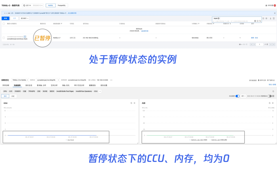 那么下面我们来模拟一下用户恢复实例的链接不断机制。首先我们选好一个暂停状态的 serverlss 实例,如果其在运行中我们也可以通过手动暂停来停止实例的运行。