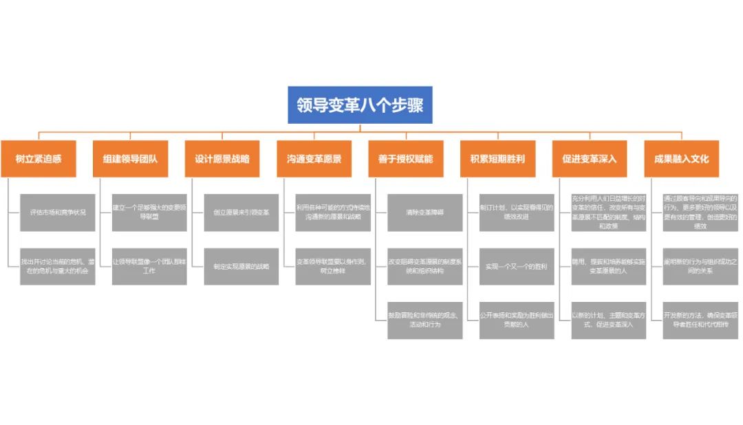仔细研读这本书,我们将变革理解为“落后变化太多导致需要整体革新,向死而生”。虽然很多时候企业并不会让自己落入到这样的境地,但书中说明的推动变革的思考和理念还是值得借鉴的,其核心思想用白话来讲就是: