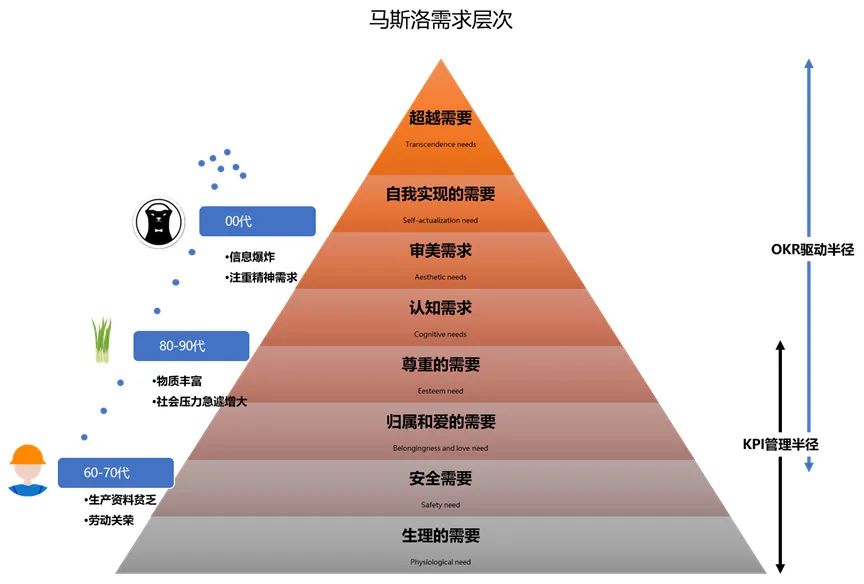 再看当下,00 后已经在“整顿”职场。他们是在信息爆炸环境中成长起来的一代,也是在物资丰富吃穿不愁的一代,相比于 80 或者 90 后,他们已经不是单纯地在“搞钱”,而是更加关注职业发展、工作体验和个人价值。所以面向参与者,我们要站在他们的视角来看,00 后群体需求层次已经上升到高于归属,尊重,触及审美甚至自我实现。