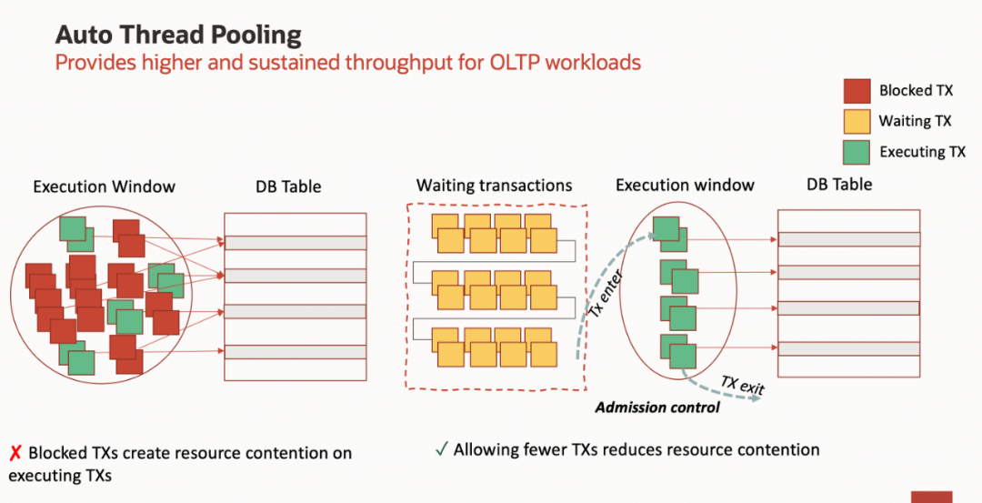 自动线程池。自动线程池能感知工作负载。在高并发场景,会智能地对传入的事务进行排队,以避免因等待事务过多而导致的资源争用。这样即使在高并发场景,数据库的吞吐也能保持在一个很稳定的状态。