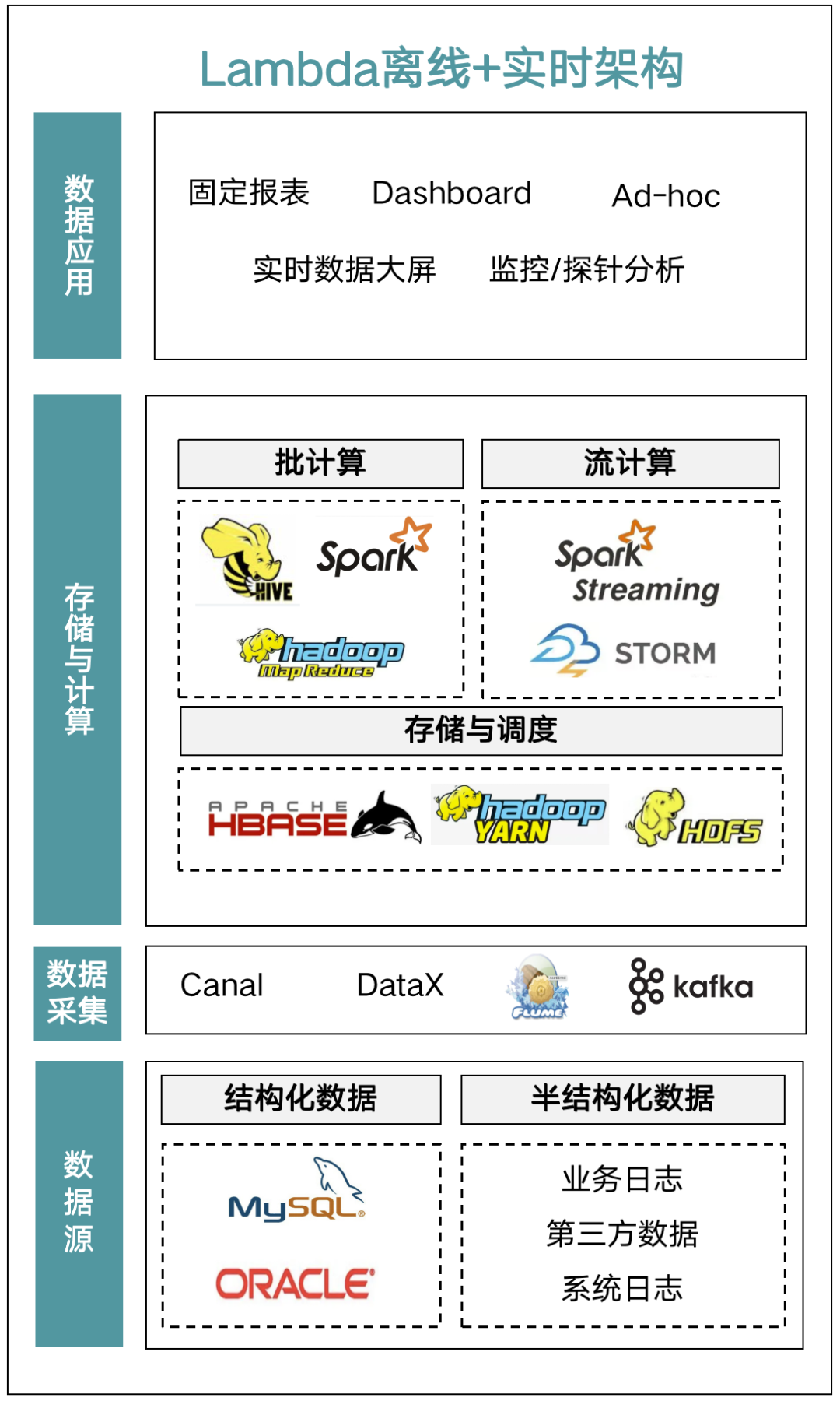 第一个阶段,就是传统的离线架构。第一代是以 Apache Hive(以下简称 Hive)、MapReduce、HDFS 为代表的纯离线数仓。这个阶段下,很多公司刚开始搭自己的大数据技术,数据体量和数据规模都不是特别大,通常在 TB 级,维度也不是很多。业务团队的需求通常是 T+1 型的固定报表任务,它的架构痛点非常明显,就是离线大数据架构不能处理实时业务,固定报表反馈出的数据价值是很低的。