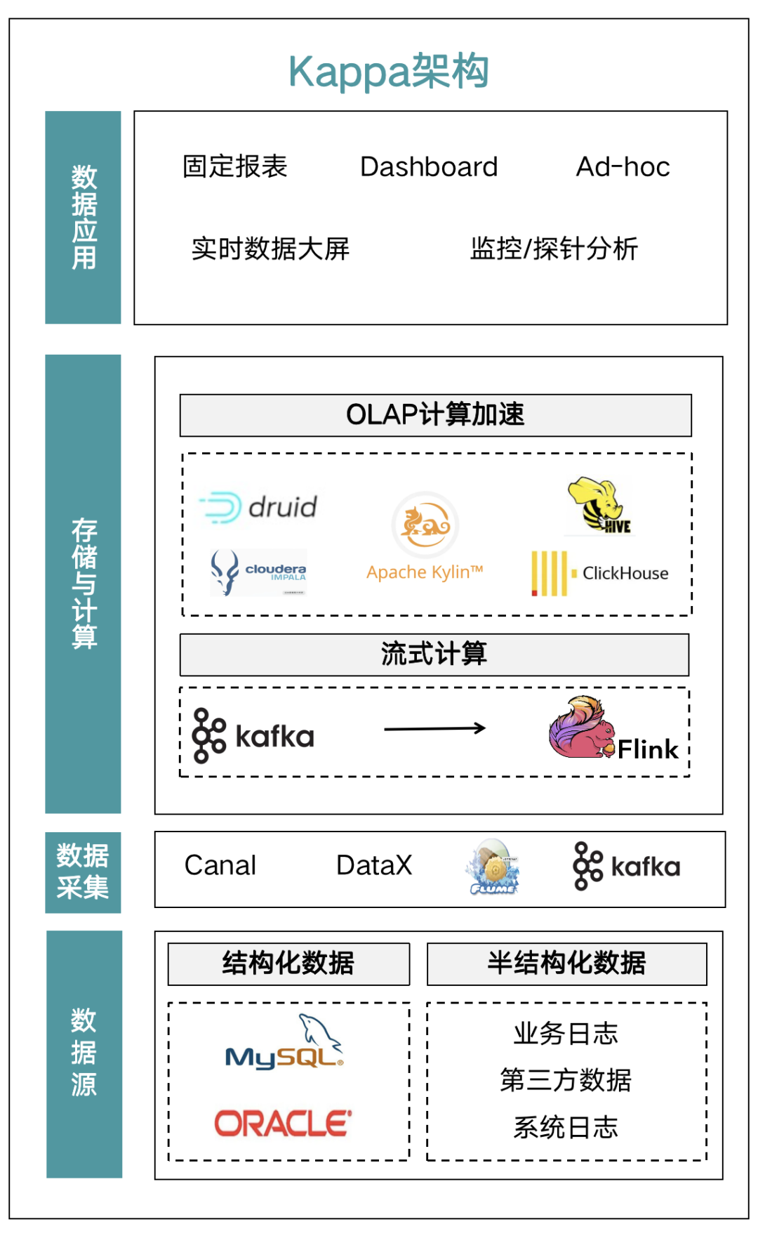 后来就衍生出了 Kappa 架构。Kappa 架构通过改进流式计算架构中的计算和存储处理过程,使实时计算和批处理能够共用一套代码,解决了 Lambda 架构中“流批分离”的复杂处理链路和维护两套代码的问题,从而实现了我们通常所说的“流批一体”。但是 Kappa 架构也存在一定缺点,无法支持海量数据存储,也无法支持高效的 OLAP 查询。