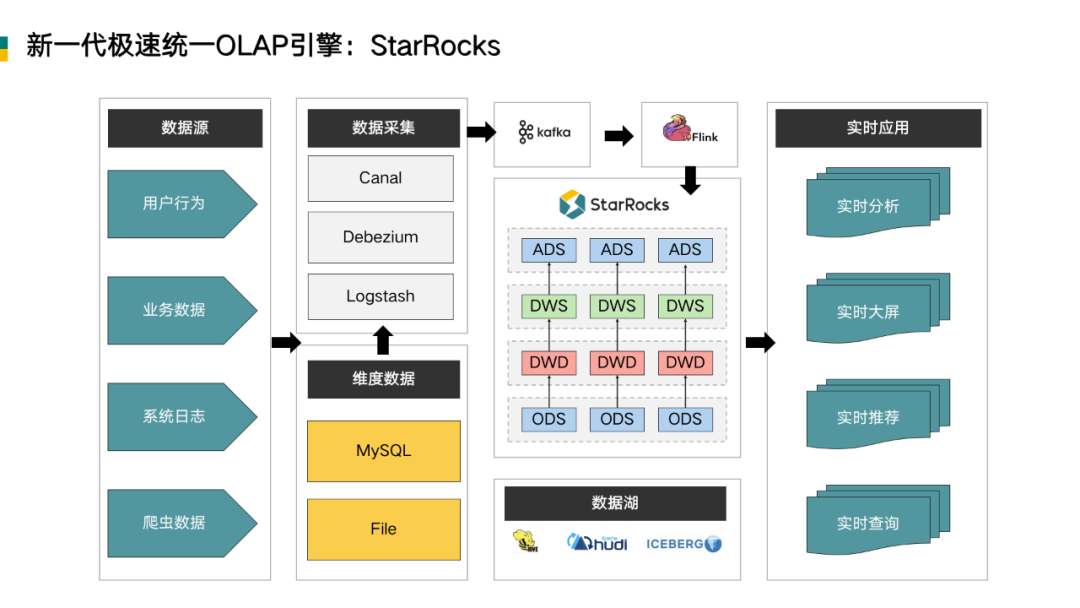 StarRocks 也可以支持数据变更和高并发的业务查询,同时借助 Iceberg、 Hive 外表等功能,打造出新一代的湖仓一体的架构。Iceberg 或者 Hive 中有价值的数据可以流入 StarRocks 进行关联查询,StarRocks 里的隐藏价值数据或者价值不太高的数据,也可以流向 Iceberg 或者 Hive 中 ,以低成本的方式长久保存,供未来数据挖掘使用。