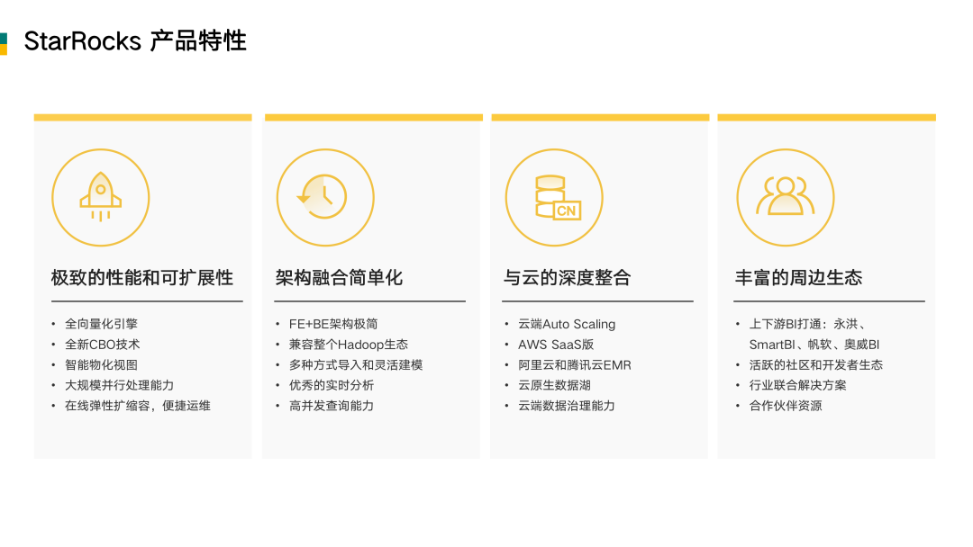 其他特性:第一是安全稳定。第二是生态相对来说比较完善,因为 StarRocks 两年多的积累,再加上各个生态合作伙伴的鼎力支持,融合了非常多上下游的产品和技术,从而能够给企业提供相对完善的解决方案。第三是完全自研自主可控,原厂有丰富的基础知识和培训,因此我们可以做到 7x24小时,全天候应急响应,节假日不休。全国在六地有研发中心和知识中心,特殊需求可以派专家去现场保驾护航。
