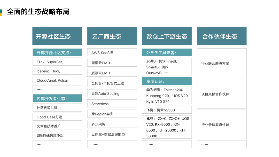 三是完善的云原生能力。StarRocks 不仅仅支持在不同的云平台基于云主机做私有化部署,还支持在阿里云和腾讯云的 EMR 上做半托管集群部署,以及目前在 AWS 上已上线的、未来可能在其他云厂商平台上线的全托管 SaaS 版。这样可以充分发挥云本身的优势,比如弹性伸缩、高可用,此外未来也可以结合更多的云原生能力,如数据治理(DataWorks) 。