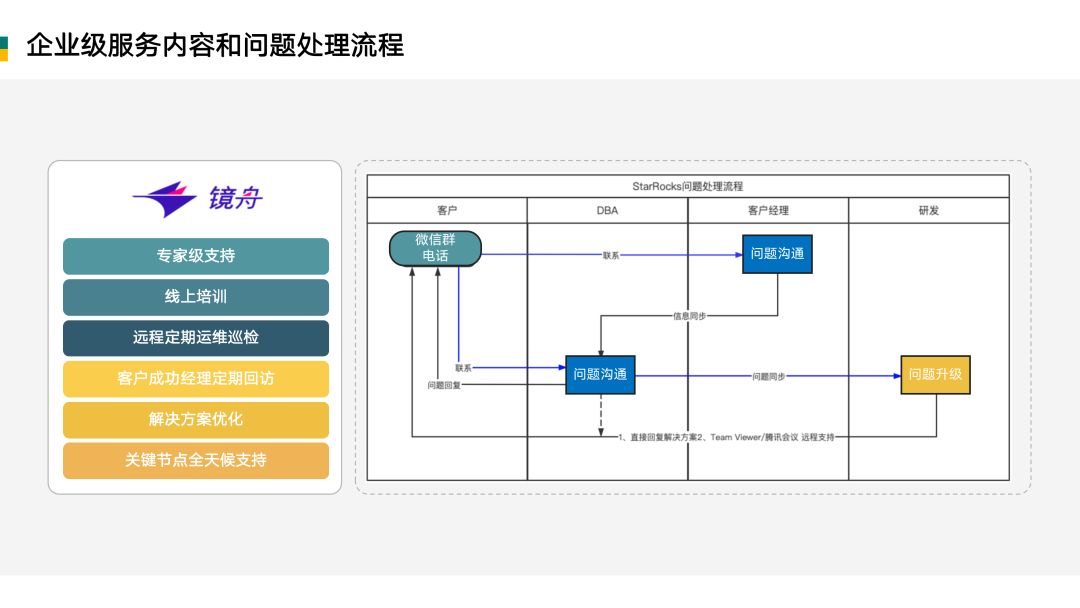 所以毫不夸张地讲,就 StarRocks 面世到现在,以及镜舟做企业版这么长时间以来,所有产品功能的 feature 没有一个是闭门造车出来的,全都是由同客户的互动、同客户的交流,同客户的业务场景,不断尝试最后创造出来的。我们认为这样才叫做真正的“客户成功”。