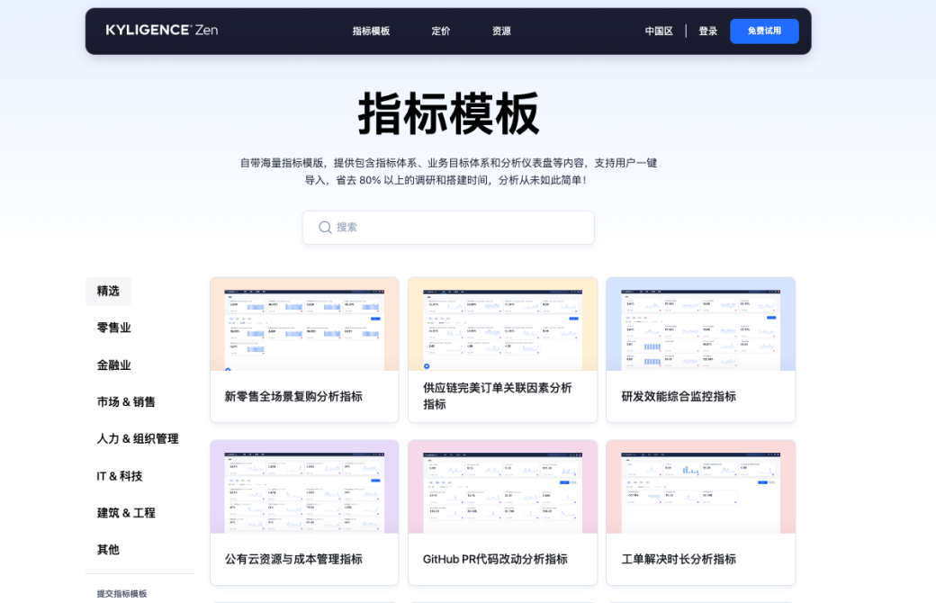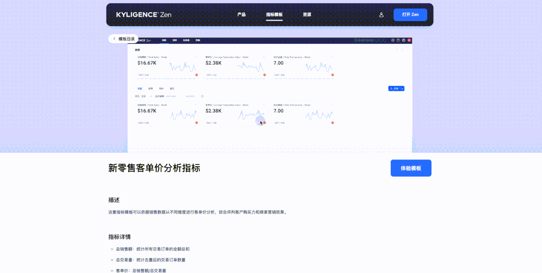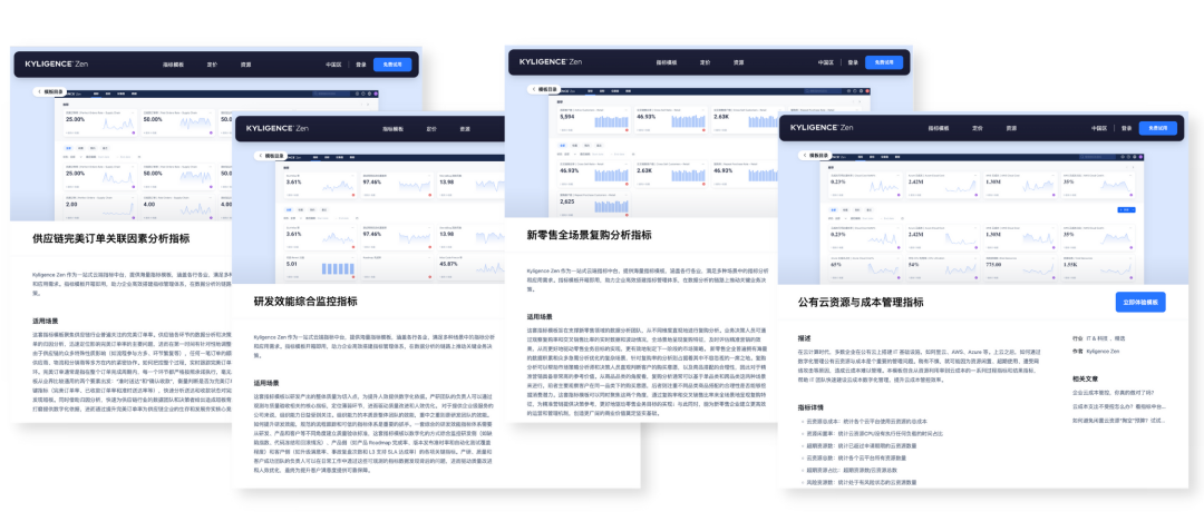 海量指标模板主要基于 Kyligence 多年服务各行各业客户的一线实践经验沉淀而来,并通过行业调研、对比分析等方式,不断优化和完善。指标模板包含业务场景描述、指标定义、计算规则描述和样例数据集,用户只需在相应页面点击「体验模板」,即可将模板导入自己的 Kyligence Zen 账号,使用指标进行多维度多数据的分析。