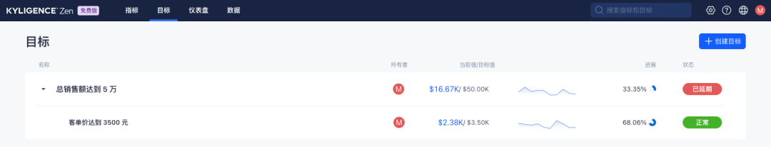 2. 在「目标」页面创建目标,如“总销售额达到 5 万”;关联指标 总销售额 后即可查看公司整体销售情况的进展与状态。