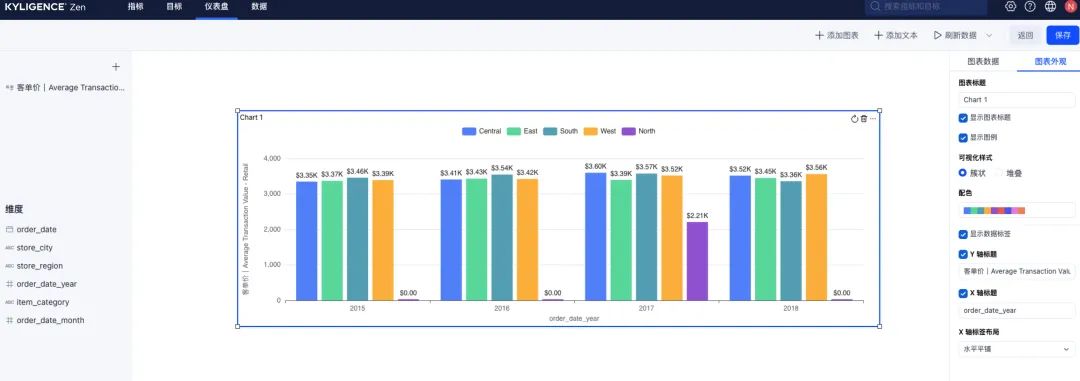 3. 用户还可通过 Kyligence Zen 的仪表盘功能,叠加时间、地区、类别等多个维度进行分析。以上是基于样例数据实现的指标分析效果,您也可在「数据」页面替换实际场景数据后详细查看。