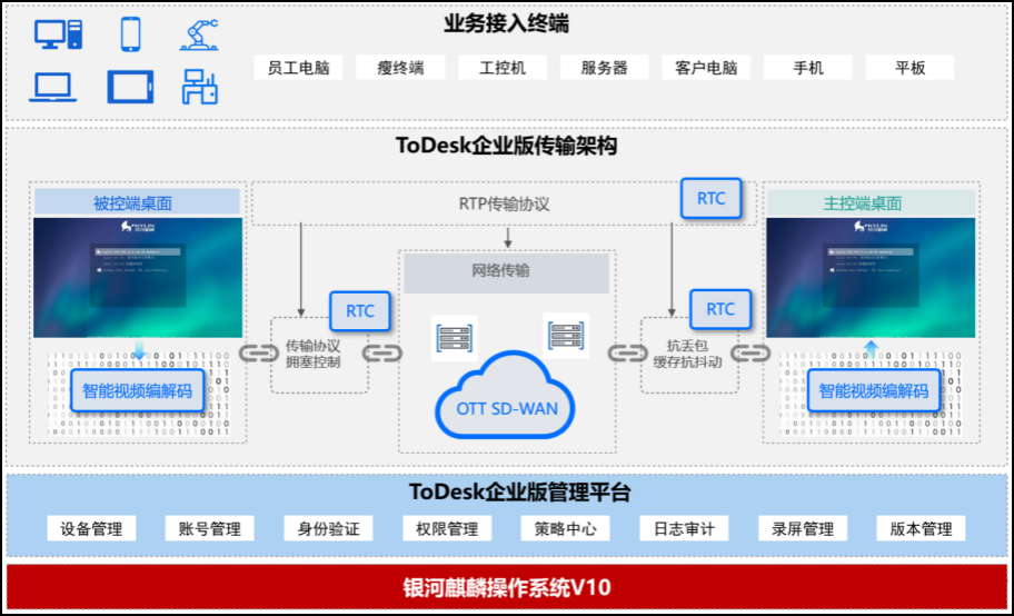 随着办公模式和信息架构的加速革新,政企用户对于办公结构转型的探索也不断深入。基于银河麒麟操作系统与ToDesk企业版的安全远程控制管理解决方案,可帮助政企搭建安全、自主的远程桌面管理体系,提升远程办公、远程设计、远程运维效率,助力企业挖掘降本增效潜力,提升政企“数字化韧性”。目前方案已全面适配飞腾、鲲鹏、海光、兆芯、海思麒麟等国产处理器平台,持续为工业、制造、金融、医疗、能源、教育等行业安全远程服务护航。