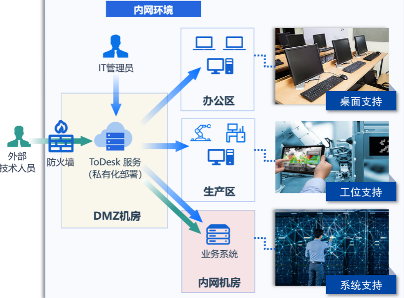 大型集团型企业有厂区大、分支多的特点,长期面临IT服务碎片化、支援速度跟不上的难题,员工电脑问题不能及时解决、业务系统排障低效。该方案可以为IT部门提供高效灵活的支援和管理服务,为各办公区和生产区的员工提供随时随地的远程技术支持,并能够在高度受控的条件下对关键业务系统发起远程诊断和排障。