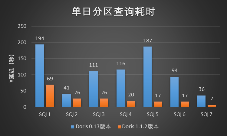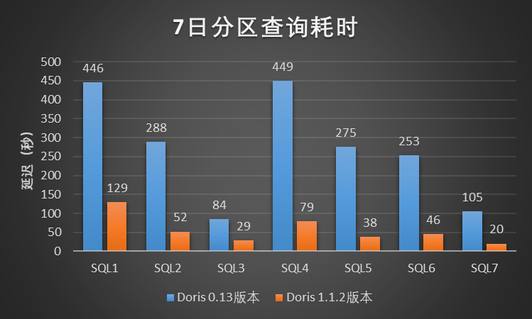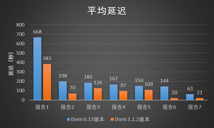 我们选择了 A/B实验场景下的 7 份 A/B 实验报告对两个版本进行测试,每份 A/B 实验报告对应小米 A/B实验平台页面的两个模块,每个模块对应数百或数千条查询 SQL。每一份实验报告都以相同的并发向两个版本所在的集群提交查询任务。测试结果如图所示,Doris 1.1.2 版本相比 Doris 0.13 版本,总体的平均延迟降低了大约 52%。在该测试中,Doris 1.1.2 版本相比 Doris 0.13 版本的查询性能提升了超过 1 倍。