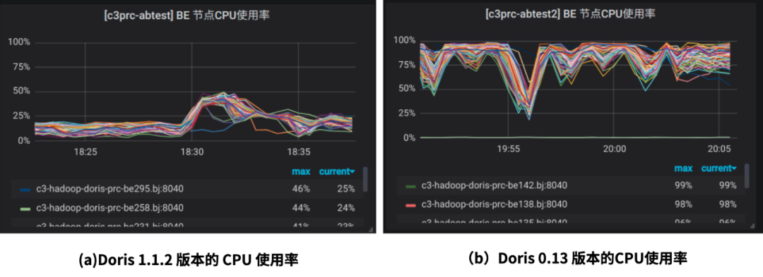false,让 PageHeap 对空闲内存进行更多的缓存。果然,调整完成之后,CPU 使用率可以打到几乎 100%。在 Doris 1.1.2 版本,数据在内存中采用列式存储,因此,会相比于 Doris 0.13 版本行存的方式有更大的内存管理开销。