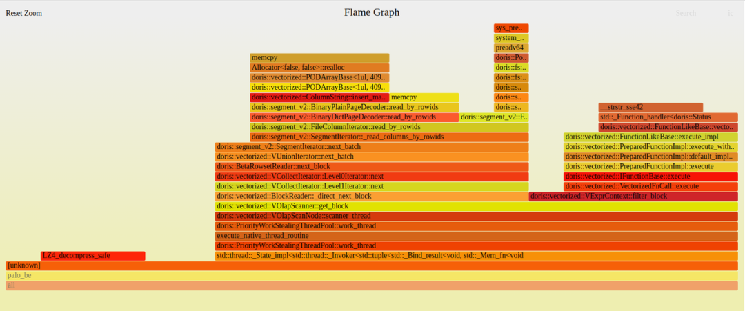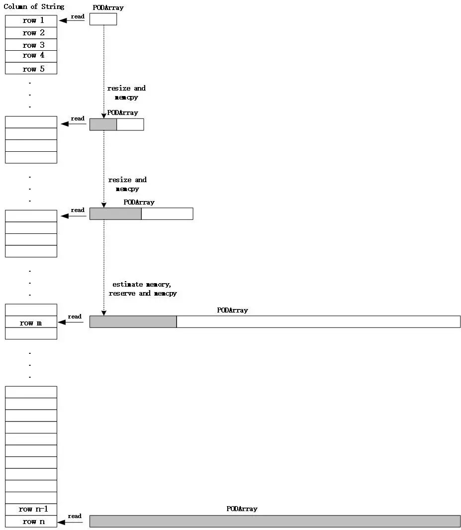 在小米的场景中有很多字符串类型的查询字段,Apache Doris 1.1.2 版本使用 ColumnString 对象来存储内存中的一列字符串数据,底层使用了 PODArray 结构来实际存储字符串。执行查询时,需要从存储层逐行读取字符串数据,在这个过程中需要多次对 PODArray 执行 Resize 操作来为列数据申请更大的存储空间,执行 Resize 操作会引起对已经读取的字符串数据执行内存拷贝,而查询过程中的内存拷贝非常耗时,对查询性能影响极大。