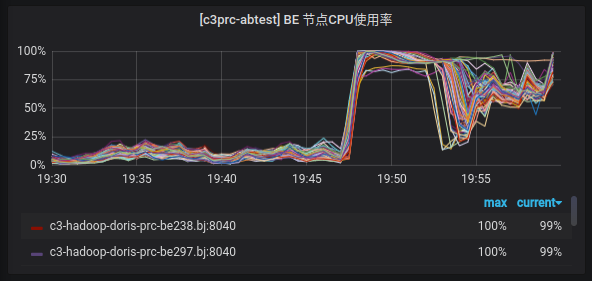 在并发测试中,我们将小米A/B 实验场景的查询 SQL 按照正常的业务并发分别提交到 Doris 1.1.2 测试集群和小米线上 Doris 0.13 集群,对比观察两个集群的状态和查询延迟。测试结果为,在完全相同的机器规模、机器配置和查询场景下,Doris 1.1.2 版本的查询延迟相比线上 Doris 0.13 版本整体上升了 1 倍,查询性能下降非常明显,另外,Doris 1.1.2 版本稳定性方面也存在比较严重的问题,查询过程中会有大量的查询报错。Doris 1.1.2 版本在小米A/B 实验场景并发查询测试的结果与我们的预期差别较大。并发查询测试过程中,我们遇到了几个比较严重的问题: