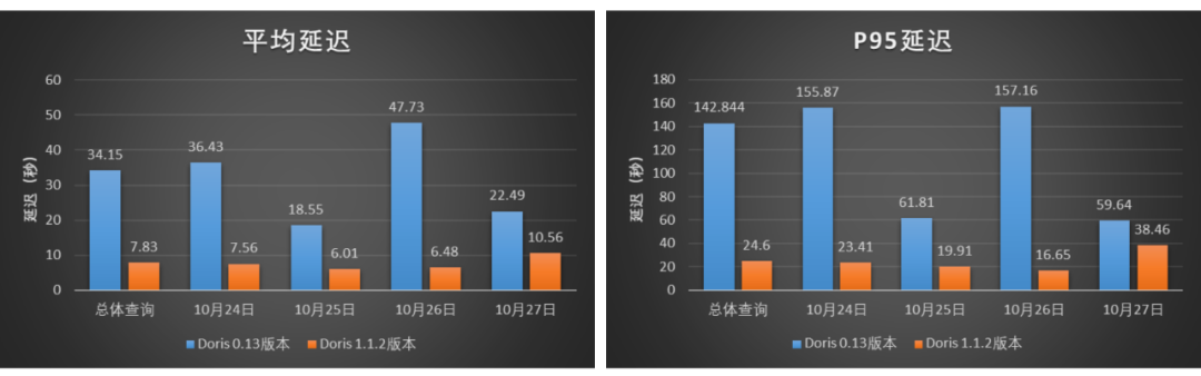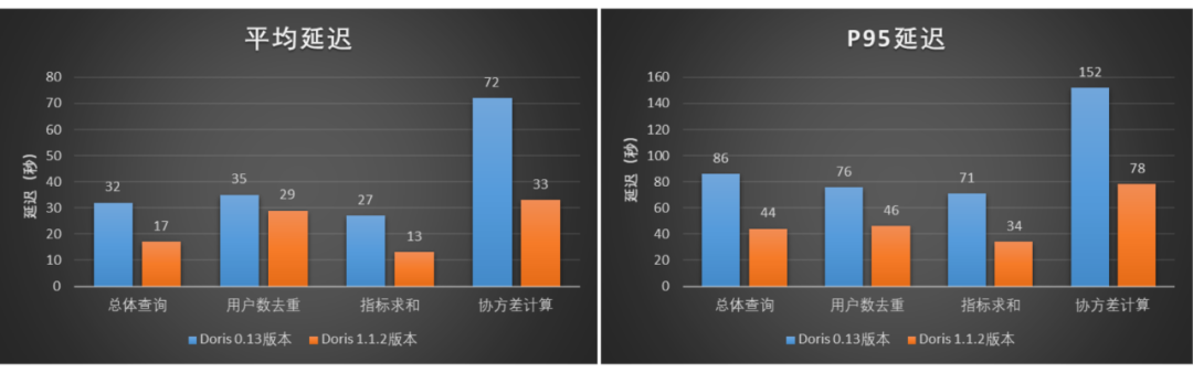 我们基于小米的 A/B实验场景对 Apache Doris 1.1.2 版本进行了一系列调优,并将调优后的 Doris 1.1.2 版本与小米线上 Doris 0.13 版本分别进行了并发查询测试。测试情况如下: