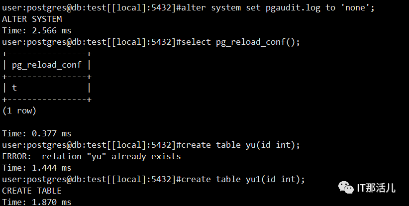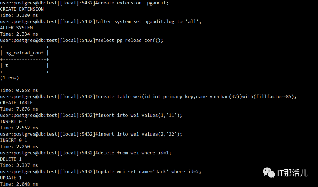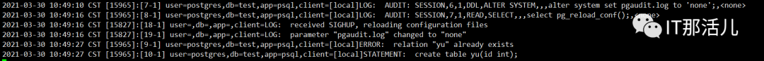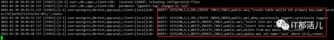 ▼▼▼vi $PGDATA/postgresql.confshared_preload_libraries='pgaudit'pgaudit.log = 'all, -misc'pgaudit.log_catalog = onpgaudit.log_client = onpgaudit.log_level = logpgaudit.log_parameter = onpgaudit.log_relation = onpgaudit.log_statement_once = on数据库重启:pg_ctl restart -D $PGDATA