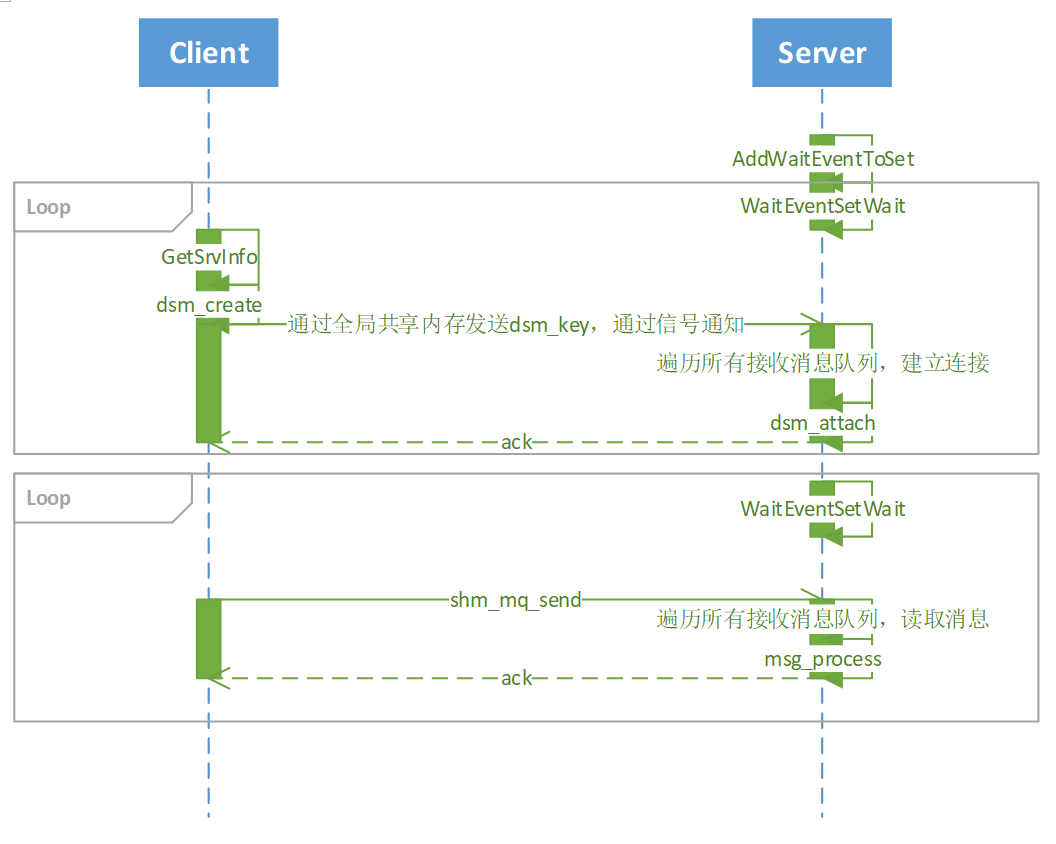 服务端在启动时,会创建latch机制,用于后台进程的连接建立和后台进程的消息处理。守护进程会在全局共享内存中为各个服务端进程创建数组,此数组用于后台进程记录共享内存handle信息,其用于连接信道的建立。后台进程在启动时,创建共享内存,并基于共享内存创建消息队列。然后通过前述的全局数组,记录本进程共享内存的handle,并通过信号通知服务端进程。服务端进程在接收到信号后,Latch机制触发处理,其首先遍历全局连接数组,在发现新连接过来时,触发回调完成连接建立,并通过latch机制,通知对端连接建立完成。后续Backend即可通过消息队列发送消息,通过消息队列接受消息,通过信号通知对端。相应的服务端进程通过遍历所有接收消息队列,接受并处理消息,然后通过发送消息队列逐个发送处理结果,同样通过信号通知对应的后台进程。