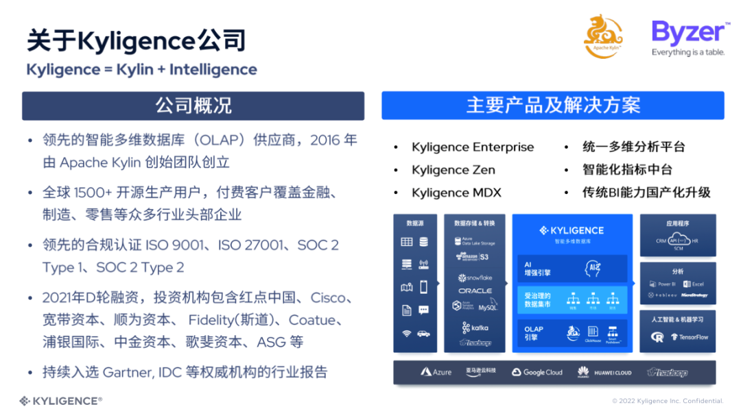 首先简单介绍一下我们公司,公司名字 Kyligence 其实是 “ Kylin ” 加 “ Intelligence ” 的一个组合。关于 Kyligence 的前身,大家应该知道在开源技术和大数据领域,有一个知名开源项目叫 Apache Kylin,这是第一个完全由中国人贡献到 Apache 基金会的顶级开源项目,Kyligence 由 Apache Kylin 创始团队创建,打造下一代企业级智能多维数据库,为企业简化数据湖上的多维数据分析。公司于 2016 年成立,经过 6 年的时间,在全球已经积累超过1500 家开源生产用户,上百家付费企业客户,分布在中国、美国、欧洲及亚太的多个银行、证券、保险、制造、零售等行业。