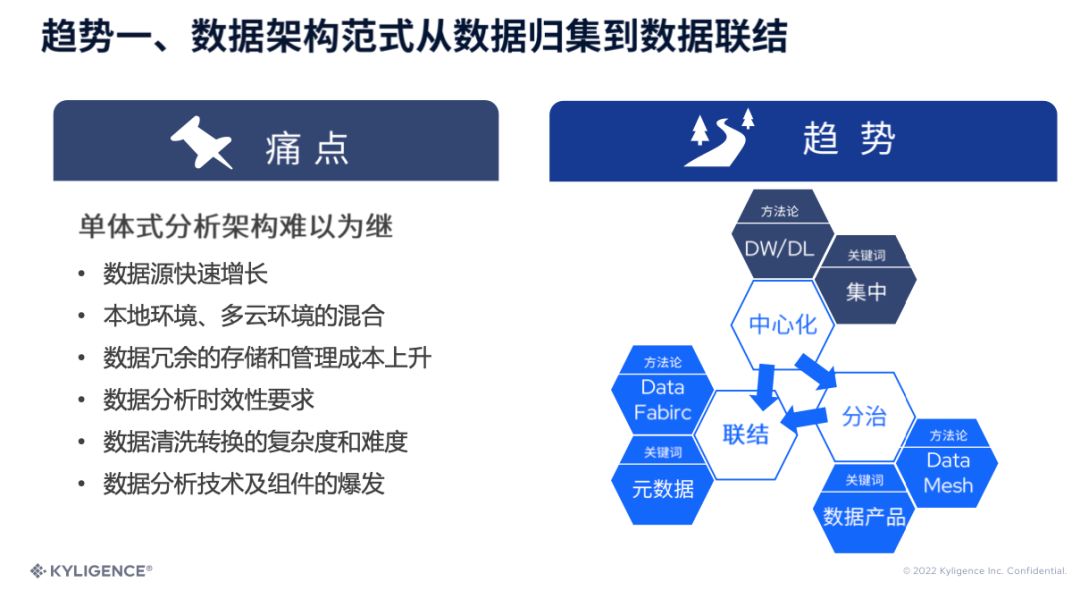 第一个趋势是数据架构范式的趋势,叫做“从数据归集到数据联结”。其实不仅仅是银行,我觉得企业现在面临的大环境是,数据来源越来越多,而且数据呈现爆炸式增长。在做传统的数据能力建设时,大家做的是单体式分析架构。所谓的单体式分析架构,就是在做传统的数据仓库、数据湖时,先把数据汇集到一起,然后有一个集中的平台来提供整个数据能力的支撑。无论数据分析或者其他数据服务,都会有这样的一个动作,所以大家可能经常听到做数据的人会提到“做数仓”、“做数据采集”、“做 ETL ”等等的一些动作。但是在新的大数据环境下,无论是内部数据还是外部数据,无论部署模式是在本地还是云上,传统的单体式分析架构都开始遇到瓶颈,并且暴露出很多痛点。对于银行业来说,随着业务模式的转型,企业会更多地关注外部数据,在新业务出来后,数据来源的增长是远远超过其本身的数据采集和归集能力,说白了就是数据收回来的速度赶不上数据消费的速度,这种模式也会带来数据冗余的存储,相应的管理成本会更高,支撑一线数据分析需求的难度也会更大。