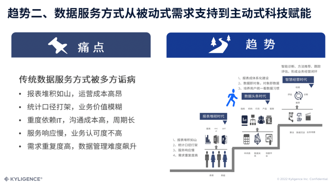 第二个想跟大家分享的趋势是关于数据服务方式,叫做“从被动式需求支持到主动式科技赋能”。左边列出来的传统数据服务方式的痛点,相信大家都有所了解,我们把数据服务方式未来的发展定义为三个阶段。大家知道传统的数仓建设服务都是类似报表或者仪表盘的分析方式,IT 对于业务需求都是被动地响应。但是随着银行的数字化转型,数据消费需求不仅限于中后台管理者需要做数据分析,一线业务人员对数据的消费需求也会越来越大,因为银行的数字化转型更多地是来自于业务驱动。业务人员去做增长的时候也需要更多的数据支撑,以传统的“业务提需求,我做一个报表”的被动响应模式已经不能满足业务增长的需求。所以我们把原本的时代叫作“报表时代”,现在我们定义的未来数据服务时代一个叫“数据头条时代”,一个叫“智慧运营时代”。