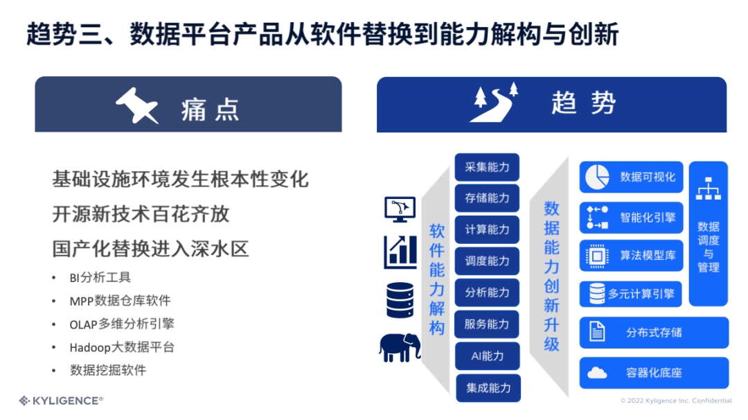 Kyligence 有幸参与了某国有银行进行传统 OLAP 分析软件和数据挖掘产品的国产化替换过程,我们不是拿自己的软件去跟国外的被替换软件对标,而是在满足基本能力的同时,配合客户未来的数字化转型需求和数据能力建设规划进行不断的创新,并且要同时考虑如何能兼容和迁移原有的应用。这里我想举个例子,例如国内的汽车市场,在燃油车领域去超越国外其实已经很难了,国外车企在这个领域有很多先发优势和专利门槛,但是我们通过电动车的模式去替换的时候,发现这是一个可以弯道超车的方式,国内相关企业并不是以完全对标原来的汽车组件的方式,而是以一整套新的解决方案去解决问题,这也是我们看到的接下来在国产化软件替换方面存在的趋势。