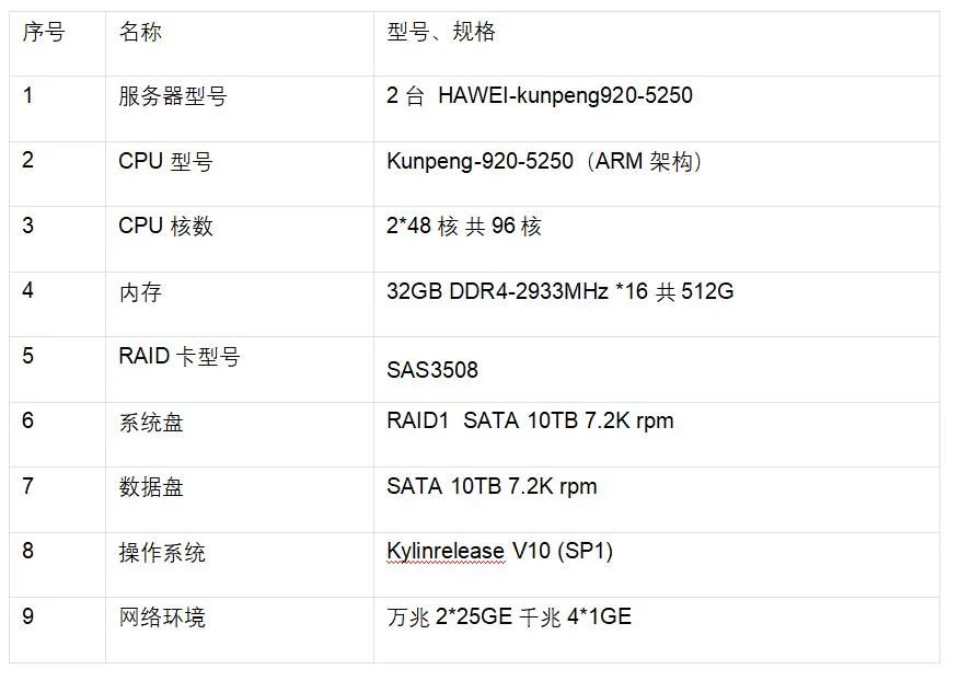 本次测试的被测样机分别采用两台ARM架构服务器(HUAWEI Kunpeng 920-5250),服务器操作系统选用银河麒麟操作系统V10(SP1)版本。