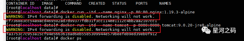 启动的时候如果报以上的警告,说明「IPv4转发已禁用。网络是行不通的」,虽然容器启动了,但是外网无法访问,只需要门开只需要开启就可以了。
