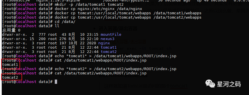 docker cp tomcat:/usr/local/tomcat/webapps data/tomcat2/webapps这里复制镜像文件,只是为了后面做数据卷挂载用的,其实没有必要一定要cp,可以直接在上一步骤直接创建相应的nginx、webapps目录进行挂载就行,之所以这么做,是因为演示过程中实现对webapps下的index.jsp做一些修改,不然后面访问不好区分