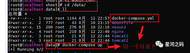 编写完docker-compose.yml之后,将其上传到服务器中,然后就可以通过docker-compose.yml来启动Nginx和tomcat