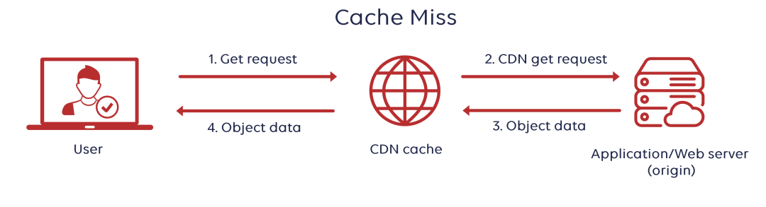 用户打开您网站的主页,例如,图片的副本(静态内容)从用户附近的缓存服务器加载,因为以前的用户已经使用过相同的内容。这就是缓存命中率需要时间积累的原因。开始时,缓存命中百分比将为 0%。然后随着缓存服务器创建数据副本,它会慢慢开始增加。但是对于很多缓存服务器,这可能需要一段时间。缓存未命中示例
