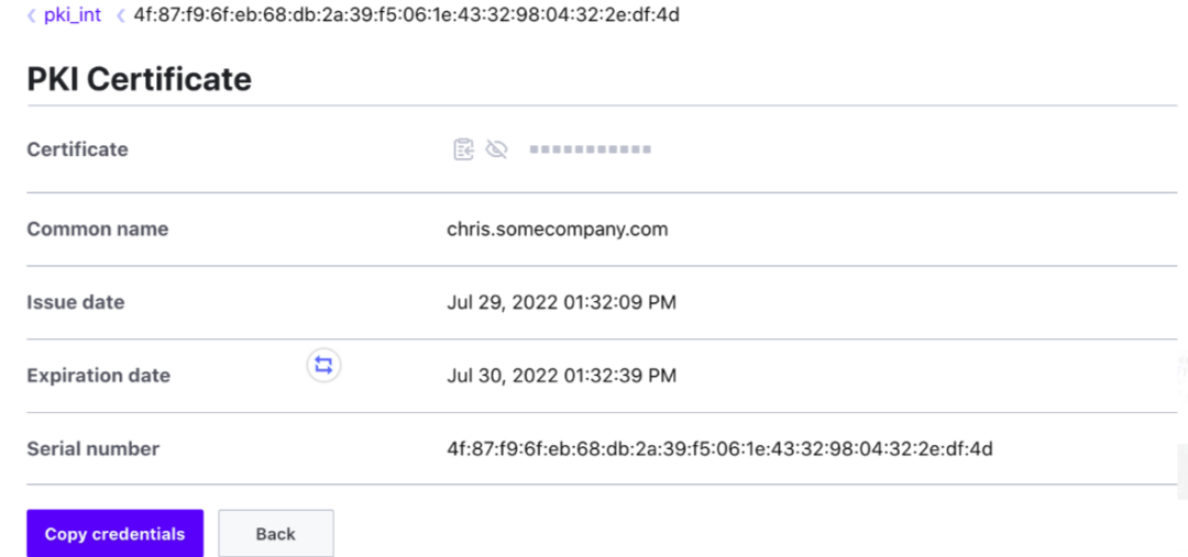 vault write pki_int/issue/allowit common_name="chris.somecompany.com" ttl="24h"